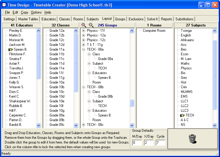 To speed up capture, simply click on the column heading to lock it, then select the required items. In the above example, I locked the educators, then selected Spears B.; I then locked the subjects and selected TECH. Finally I then dragged Grade 08a into a new Group, then I dragged Grade 08b onto a new Group. The educator and subject where immediately added as well.