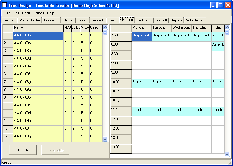 Here is a shot of all the groups that we created in the layout screen. They are highlighted in yellow to indicate that they have not been completely placed yet. You are also able to edit their names, the minimum and maximum periods per day, as well as the total periods required per cycle over here.