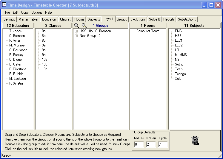 This is where you create the groups/ties/combinations(put your own terminoligy in here). Simply 'Drag and Drop' the combination of Educators, Classes, Rooms(if required) and Subjects onto the 'New Group - xx' label in the Groups column. The combination can be as simple or as complex as you require, there is no limit on any of the criteria.